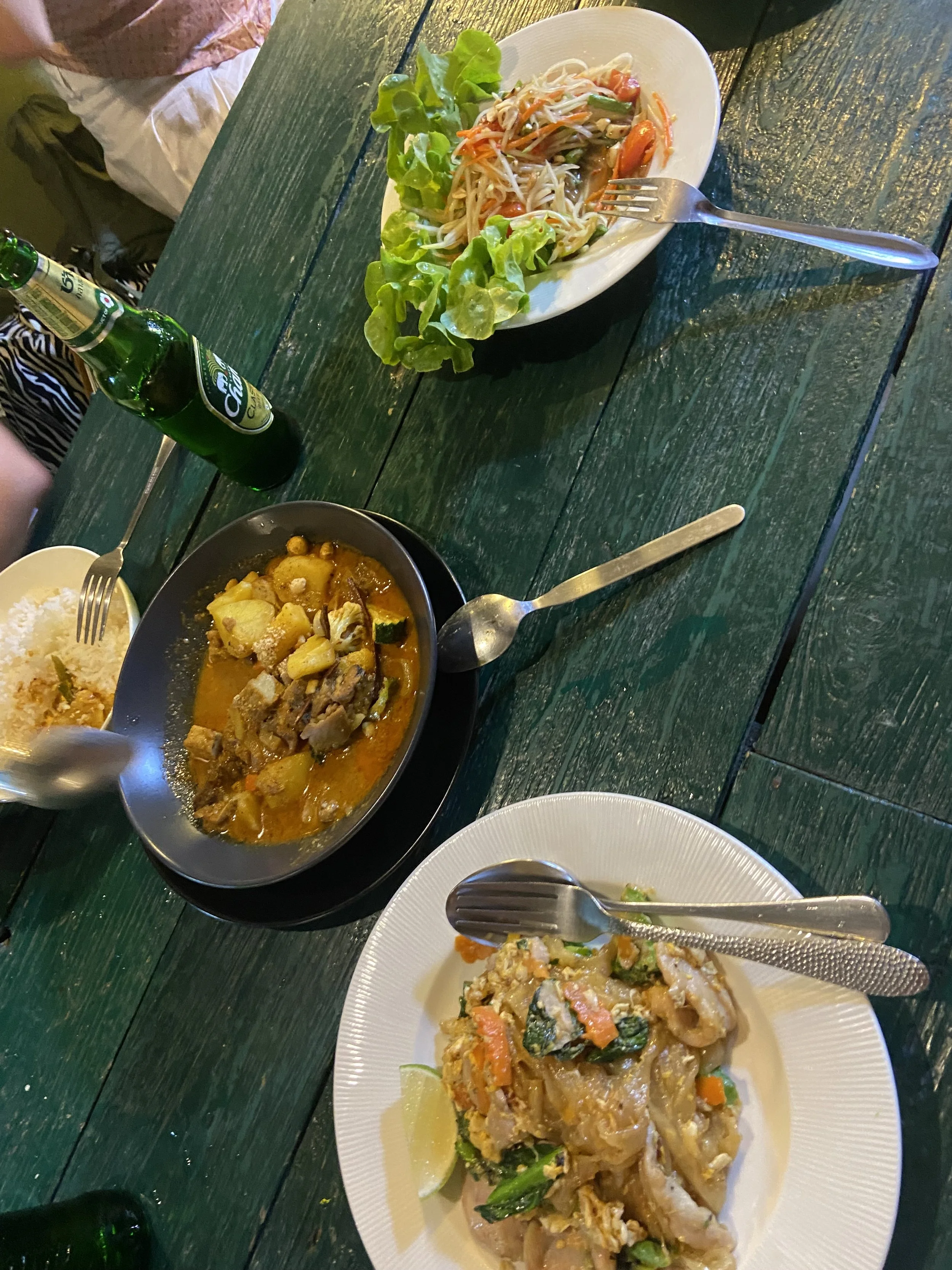 We met up with Meggies friends who are travelling for a year as digital nomads for a passionfruit mojito (£2 at happy hour) and called my Louis to let him know I was thinking of him (as I usually do). We went for a delightful meal where I tried Papaya Salad which is very famous here but a little spicy and had some of Meg’s Masaman Curry (also very famous) and then got some beers at a jazz bar.